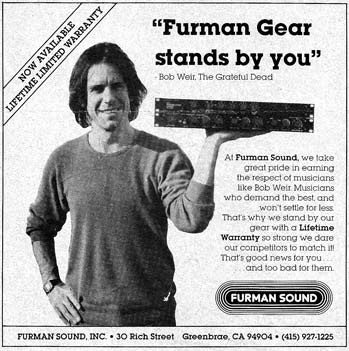 These two ads appeared in various guitar and pro audio mags around 1983. The photos were shot in the street outside of the Dead's rehearsal studio, Club Front, by photographer and Dead chronicler David Gans. I confess that under deadline pressure, I wrote the rather lame quotes attributed to Jerry and Bob. I did show them drafts to get their approval. Preoccupied with other things, each took a quick look and said it was fine. |