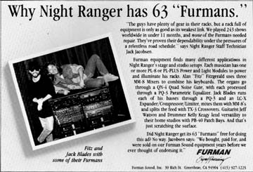 Night Ranger Endorsement Ad This half-page ad featured Allan "Fitz" Fitzgerald and Jack Blades from the stalwart 80's band, Night Ranger. They really did have 63 Furmans. They were among our biggest fans and often hung out at the Furman factory in Greenbrae. From about 1992. |