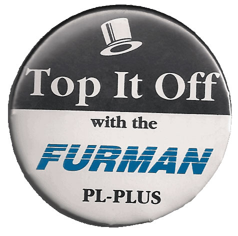 Sensing that we were riding a wave, the Furman contingent at the 1986 NAMM show all wore rented top hats and handed out these buttons. The idea was that the top slot in every equipment rack should be occupied by a PL-8 or PL-PLUS. |